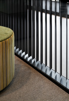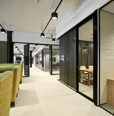 Within a meeting room with curtains in front of glass partition walls of QbiQ