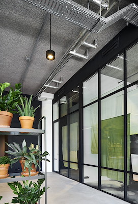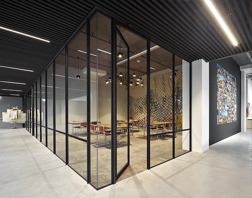 Rodi van der Horst van Inbo architecten over de systeemwanden van QbiQ: "De extreem smalle profielen benadrukken de hoogte en openheid van onze werkplaats."