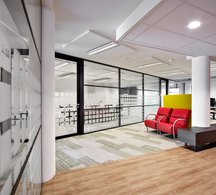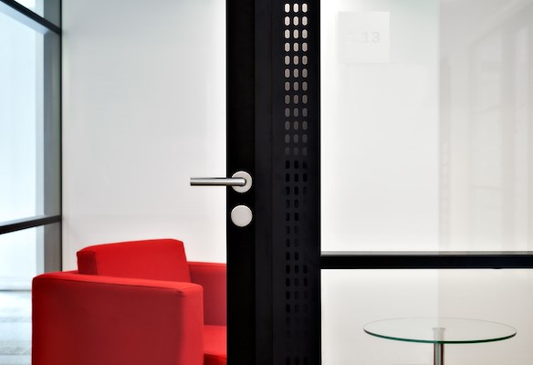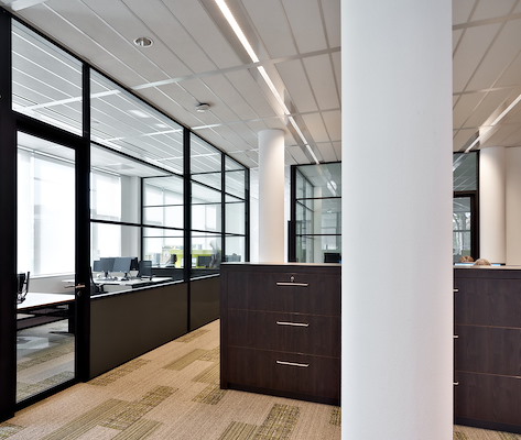 In het project Huis van Leusden zijn systeemwanden en brandwerende puien van QbiQ toegepast. Deze voltransparante brandpui IQ Protect Hightech is gecertificeerd met een EI60 attest, heeft een profielhoogte rondom van slechts 33mm in aanzicht. Deze door QbiQ ontwikkelde stalen profielen sluiten hiermee in esthetisch opzicht perfect aan bij de 0-minuten wanden met een aluminium QbiQ profiel.
