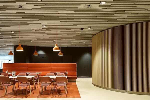 Binnen in het gebouw is een grote verandering te zien dankzij de lineaire vilten HeartFelt® panelen van Hunter Douglas Architectural. Deze panelen bedekken drie verdiepingen en een oppervlakte van 2.840m