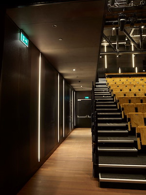 Het minimalistisch design van de noodverlichtingsarmaturen K9 zorgt voor een onopvallende integratie. Voor de foyer, grenzend aan de multifunctionele Pleinzaal, gaat ETAP nog een stapje verder. ETAP levert maatwerk door een deel van de K9-armaturen qua kleur harmonieus af te stemmen op het goudkleurige plafond en de goudkleurige wanden. Onopvallend aanwezig, opvallend wanneer het nodig is.