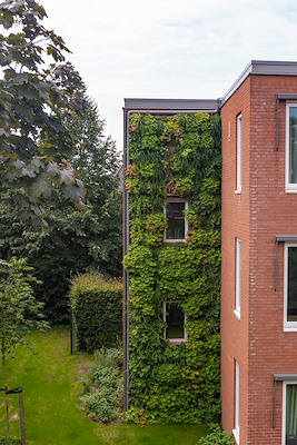 heeft zowel boven de ingang als aan de zijkanten van het pand een groene gevel met 10 diverse soorten beplanting, waarbij er is rekening gehouden is met de geveloriëntatie, laten installeren van in totaal ongeveer 64m². De groene gevels worden aangestuurd door een automatisch irrigatiesysteem waarbij er gedeeltelijk gebruik wordt gemaakt van regenwater dat wordt opgevangen op het groen-geel-blauw dak. Dit draagt bij aan klimaatbestendig bouwen en creëert een gezonde leefomgeving met verbeterde luchtzuivering en warmteregulatie.