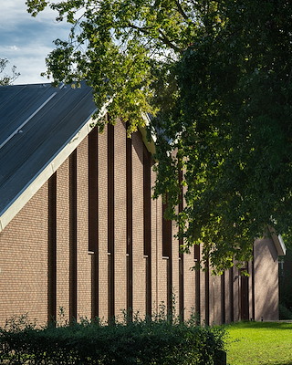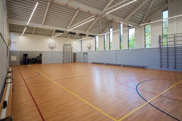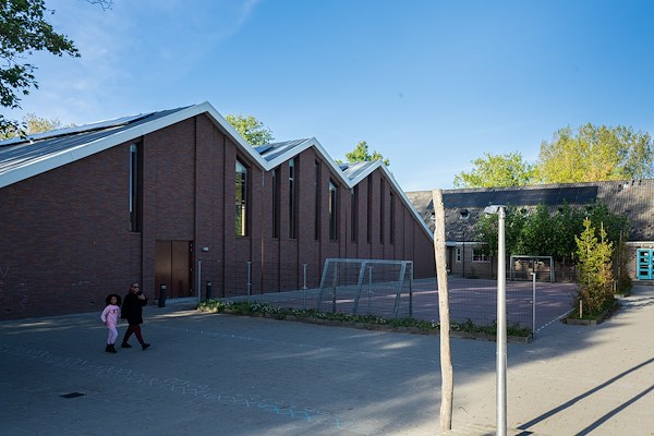 De gymzaal vormt een voorzetting van de kap van het bakstenen hoofdgebouw van de school.