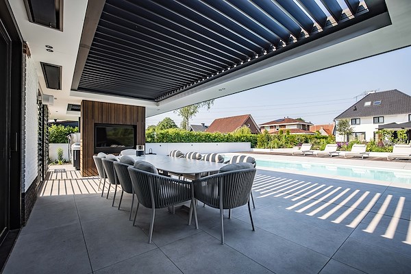 Moderne woning met louvredak in terrasoverkapping