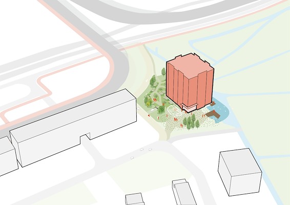 INBO ontwierp het houten gebouw, dat met veel groen en bomen in de omliggende openbare ruimte een schakel vormt tussen polderlandschap en stad. Kavel 1F ligt tegen het inundatiegebied van UNESCO-erfgoed van de Stelling van Amsterdam. De landschapsarchitectuur van Hosper is geënt op de cultuurhistorie van dit gebied.