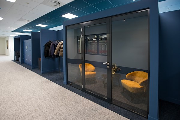 Voor het splinternieuwe hoofdkantoor van H.Z.Logistics in Maasdijk, hebben wij het volledige interieur mogen ontwerpen. De uitdaging van deze opdracht lag in de grote omvang van de ruimtes en de diverse functies en gebruikers van het gebouw. Om die grote ruimtes te doorbreken en aangenamer te maken, hebben we segmenteringen aangebracht in de vloeren en plafonds. Op maat gemaakte functionele elementen versterken deze aanpak en dragen ook bij aan een verbeterde akoestiek. Voor 3 zones in het pand hebben we een eigen uitstraling bedacht. De entree heeft de allure van een hotel lobby, met een ontvangstbalie en een eigen pantry. Het is een prachtige plek om klanten te verwelkomen en collega's te ontmoeten. De entree zone met directievleugel loopt door in een kantoortuin welke een meer moderne uitstraling heeft gekregen met een blauwe HZ-identiteit. De blauwe middenkern, waar meerdere functies in verwerkt zijn zoals een garderobe, lockers en zitelementen voor informeel overleg, zorgt voor een onderbreking in de grote ruimte. Een blauw vlak in de vloer en het plafond versterken de middenkern. Na de entree en de kantoorvleugel bereik je het gedeelte voor de nationale én internationale chauffeurs. Zij komen via een eigen ingang in een deel van het gebouw waar zich een kantine, woonkamer met een grote keuken, slaapkamers en sanitaire voorzieningen bevinden. Hier is vooral gezorgd voor een wat meer huiselijke inrichting om even te ontsnappen aan de hectiek van het verkeer.