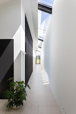 De opdrachtgevers wilde alle functies van hun droomhuis op één niveau, wat gezien de afmetingen van de kavel een uitdaging was. De oplossing werd een L-vormige woning met twee gezichten: een onopvallende zwarte schuur aan de voorzijde en een transparante witte villa aan de achterzijde.