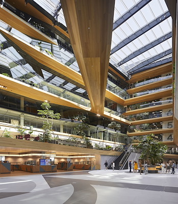Centraal in het ontwerp staat het bruisende atrium op de tweede verdieping dat alle kantoorverdiepingen met elkaar verbindt. Vanuit het masterplan was de wens om hier iets spectaculairs te ontwerpen, een soort van verbijzondering zichtbaar vanaf alle verdiepingen. Ontwerpstudio Linehouse Design creëerde voor de vloer een grafisch stadspatroon in een viertal tinten. Hier werden Mosa-specials op de vloer toegepast. Hofman: ‘Vanuit de gedachte dat het gebouw een stad is, is het atrium het centrale plein. Er zijn drie zitjes rondom hoge bomen gemaakt, waarbij het interieurontwerp heel fraai is verwerkt in het tegelpatroon. Het mooie ervan vind ik dat het enerzijds iets heel specifieks is, speciaal voor deze plek ontworpen. Anderzijds is het ook iets generieks, als vanzelfsprekend bijna. Dit samen wordt op een bijzondere manier vertaald in de vloer. Je krijgt er het gevoel dat je er wil blijven, even wil rondkijken. Daar is de tegelvloer een belangrijk onderdeel van! Het is overigens niet alleen een mooi ontwerp, het is ook nog eens goed uitgevoerd.’