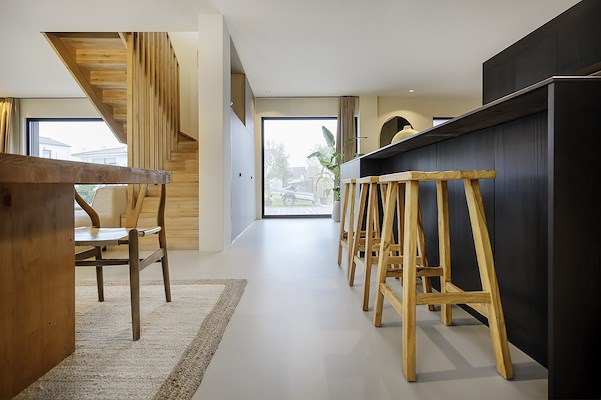“Minimalistisch, ingetogen en toch expressief,” zo beschrijft Daniel Schumann, Technisch Commercieel Adviseur bij Arturo, het vloer- en wandconcept. De designvloer in subtiele tweekleurige betonlook vormt een ideale aanvulling op het meubilair en zorgt voor een natuurlijke en moderne uitstraling. De vloer combineert de landelijke stijl met een industriële look en is ook goed te combineren als contrast met het trendy zwart van het open keukenblok.