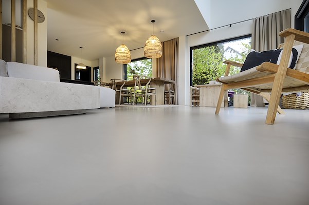 . Deze crèmekleurige gietvloer past, afhankelijk van de lichtinval, perfect bij de stijl van het huis en de gebruikte materialen en kleuren.