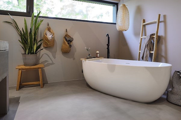 De eis om design en functionaliteit te combineren zet zich voort in de badkamer op de eerste verdieping. De eigenaren wilden een tijdloze, decoratieve bekleding in een natuurlijke look. Arturo Microcement werd toegepast op de vloer, de wanden en de inbouwkast. Deze naadloze afwerking kan in droge en natte ruimtes worden toegepast. De kleurvariaties en troffelslagen zorgen voor een bijzondere uitstraling en laten zien dat het om echt vakmanschap gaat.