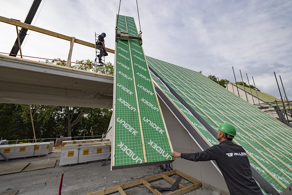 Arnold Jellema, eigenaar van Aannemingsmaatschappij Jellema, geeft aan dat er meerdere redenen zijn waarom juist de Unidek Aero dakelementen zo goed geschikt zijn voor dit project.: “Het dakelement heeft energiezuinige eigenschappen en een goede isolatiewaarde. Het is een heel strak afgewerkt product. Het dakelement is gemakkelijk en snel te verwerken. De 2-onder-1-kap-woningen doen we in een paar uurtjes, in een ochtend. Een ander voordeel is dat we geen rekening hoeven te houden met afval dat van de dakelementen afkomt. Ook kunnen in de traditionele bouw met houtskeletelementen schimmel en vocht uitdagingen vormen. Wij merken dat de dakelementen van Kingspan Unidek deze problemen goed beheersen.”