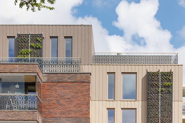 die her en der aan de buitengevels gehangen zijn. Een sterk staaltje architecturale creativiteit dat voortvloeide uit een complexe randvoorwaarde. “Gezien de nabijheid van het treinverkeer vormden trillingen en geluidshinder een complicerende factor. Er waren enkele