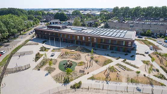 Doordat de school en de sportafdeling verbonden zijn met een grote luchtbrug, is ook een deel van het terrein overdekt zodat zelfs met slecht weer de kinderen buiten kunnen spelen. De onderzijde van deze luchtbrug is met akoestische open roosters afgewerkt zodat er geen ongewenste geluidreflecties optreden en er toch een stevige (vandaalbestendige) afwerking kon worden toegepast. Het speelterrein voor de kinderopvang is wel afgesloten, de regelgeving vereist dat nou eenmaal maar de hekwerken rondom dit afgesloten deel hebben we verborgen in groene hagen en palissades zodat het groene en open karakter behouden blijft. Op het terrein zijn ook de fietsenstallingen geplaatst, alsmede een aantal parkeerplaatsen voor halen en brengen . Ook deze zijn omgeven door hagen en bomen zodat de ruimte niet verstoord wordt door gestalde fietsen en geparkeerde auto’s.