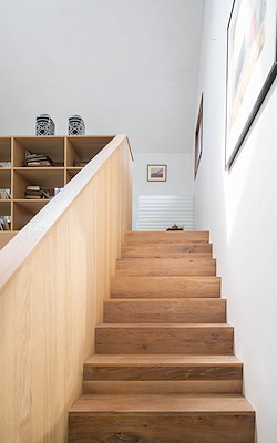 De tweede woning is compacter. Hier is een dakraam boven het grote trapgat gepositioneerd. Aan het einde van de trap bevindt zich een pui achter Braziliaans metselwerk. Dit brengt een interessant schaduwspel in het grote trappenhuis.