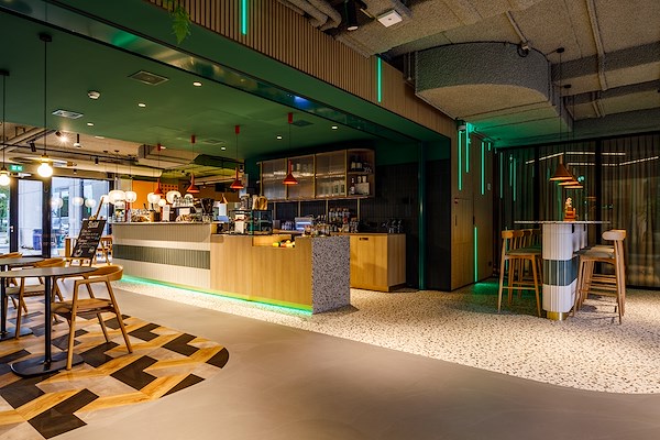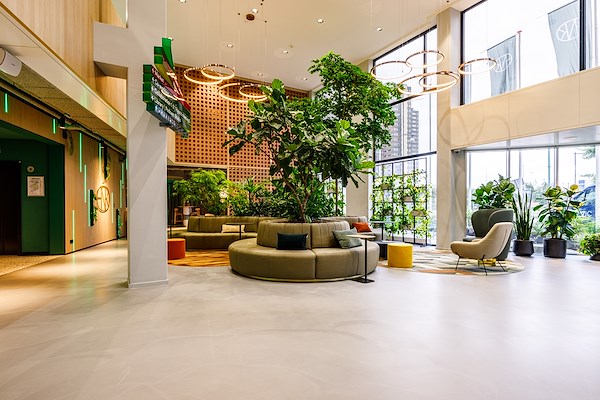 Aan de Radarweg in Amsterdam Sloterdijk biedt HNK - Het Nieuwe Kantoor - aantrekkelijke, hoogwaardige kantoorruimten, coworking-plekken en meetingrooms in een ontspannen, stijlvolle ambiance. Een atmosfeer als die van een luxe hotel, compleet met een uitnodigende lobby vol groen. Interieurarchitect Silvia Fernandez de Alaiza van hd+vk uit Hilversum tekende voor het ontwerp, waarbinnen FloorColouring van Forbo Eurocol een verbindende rol vervult. “Ik wilde een neutrale, naadloze vloer in betonlook, die rust brengt tussen de diverse elementen in het ontwerp en dat is prachtig gelukt.”
