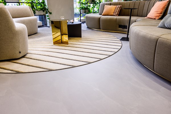 Voor de verbinding tussen alle verschillende werkplekken, ontmoetingsruimten en designelementen wilde Silvia een ‘rustige’ vloer. “Het moest niet zo zijn dat die vloer de competitie aanging met andere elementen in het ontwerp, zoals het meubilair, de unieke vloerkleden met eigen print, de wanden, verlichting en andere vloerafwerkingen. Ik wilde in ieder geval een naadloze vloer en in overleg met Linda Wijnands van Forbo Eurocol koos ik uiteindelijk voor FloorColouring. We hebben ook BetonDesign en LiquidDesign besproken, allebei ook mooie producten, maar vanwege de hoeveelheid ‘traffic’ in het gebouw en de wens voor een betonlookvloer adviseerde Linda FloorColouring. Een egaliseermiddel dat je met pigment op de gewenste kleur brengt en daarna aflakt en gemakkelijk te reinigen en onderhouden is. PMR uit Rotterdam heeft de vloer geïnstalleerd.”
