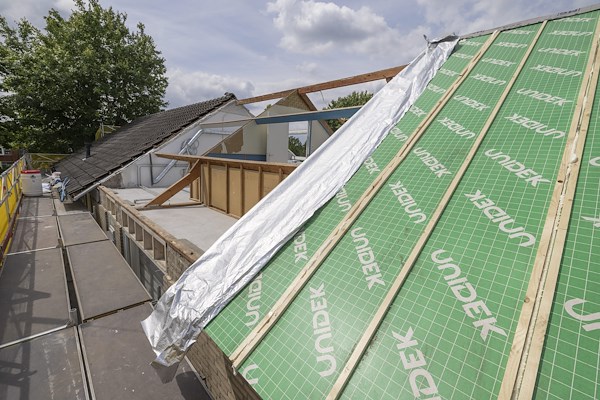 Mathieu Brant geeft ook aan wat de reden is dat er voor Unidek Aero Light is gekozen bij dit renovatieproject: “De snelle afwerking van het product is de belangrijkste reden voor de keuze van Unidek Aero Light geweest. We zitten hier namelijk met een asbesthoudend dakbeschot. Dat betekent dat we ‘s ochtends de asbest saneren. Aan het einde van de dag willen we de woning ook weer dicht hebben liggen, zowel wind- als waterdicht. Daardoor wordt de overlast voor de bewoners ook beperkt. De snelle verwerking van deze dakelementen is juist een heel groot pluspunt van deze werkwijze.”