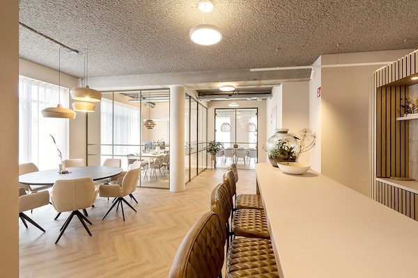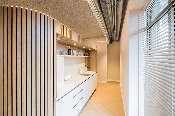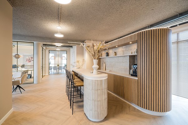 Bij binnenkomst loop je tegen het hart van het kantoor aan. De ontmoetingsplek in de vorm van een maatwerk dubbele pantry met bijbehorende zitgelegenheid. Een echte eyecatcher met een luxe en warm design. Zo wordt de toon gezet voor de rest van de kantooromgeving.