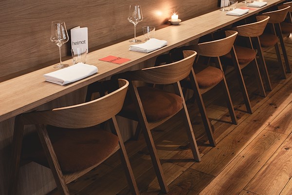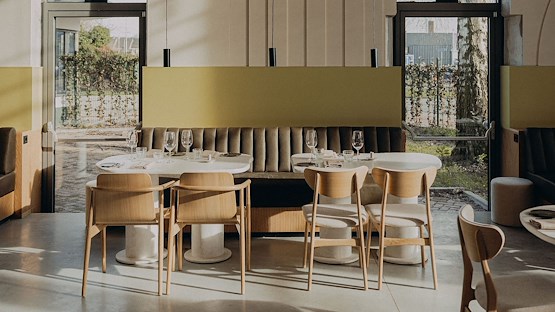 Het lichte hout, de zachte stoffering en de ronde vormen zorgen voor een uitnodigende en comfortabele zit. In combinatie met de ambiance die zowel modern als huiselijk aanvoelt is het de perfecte setting voor een avond uit.