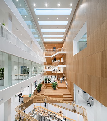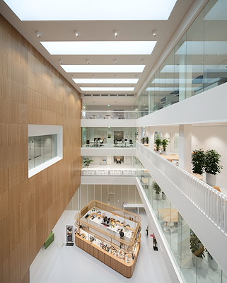 In het gebouw wordt een uitnodigende sfeer gecreëerd door een ruim houten atrium dat overstroomt met natuurlijk licht. Dit houten hart verbindt beide atria en stimuleert sociale interactie tussen de verdiepingen. De thuisbases voor de 5 verschillende studies liggen rond het hart op verschillende verdiepingen en hebben elk hun eigen herkenbare kleur. Deze intieme thuisbases weerspiegelen de betrokkenheid tussen studenten en docenten en zorgen voor een gevoel van saamhorigheid en gemak voor alle bewoners. Een sociaal hart!”