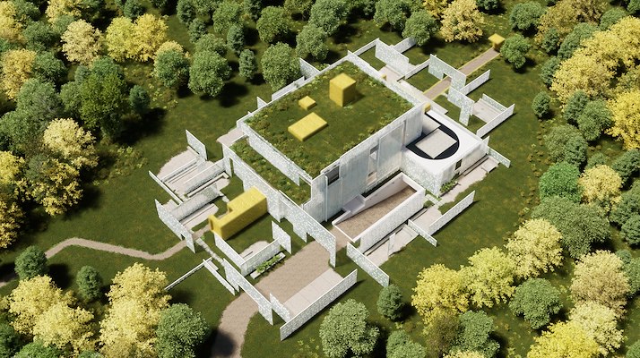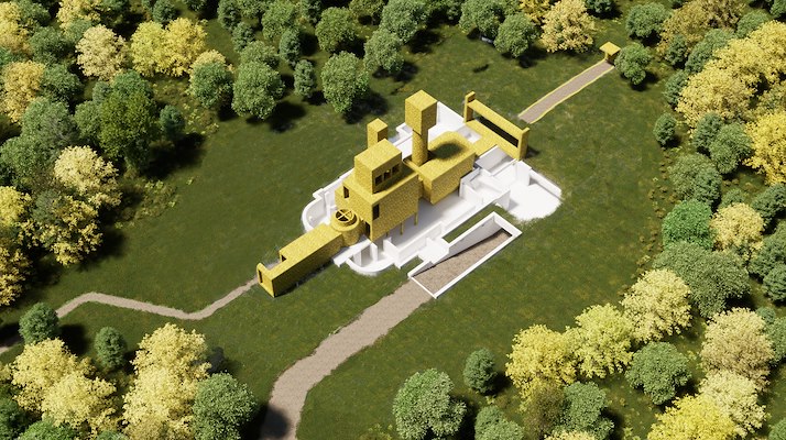 Geven we de beschouwer ook een beleving? Uiteraard krijgt iedereen die een glimp opvangt van de villa een unieke beleving. Op de open plek in de beboste omgeving, zijn in de verte transparante schijven te zien als schotsen in het groen. Mysterieus en nieuwsgierig makend. Geen rechte paden om er te komen, veranderende perspectieven bij de benadering van het gebouw.
