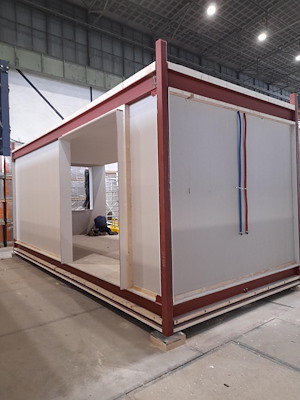 De stalen frames worden ingevuld met wanden en plafonds van Faay