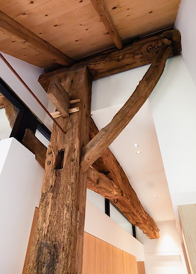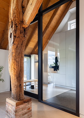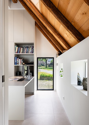 Om voldoende ruimte te creëren voor het gezin, is in de open deel een verdiepingsvloer toegevoegd. De bestaande kapconstructie en eikenhouten gebinten zijn zorgvuldig behouden en hebben in het nieuwe interieur een prominente rol.