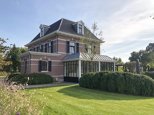 De vele grote repeterende kozijnen geven de bewoners daarbij vanuit elke hoek van de woning een prachtig zicht op de omliggende landschapstuin. De grote glazen serre met zinken kap aan de achterzijde van de woning vormt een subtiele overgang tussen de grote leefkeuken en achterliggende terras en tuin.