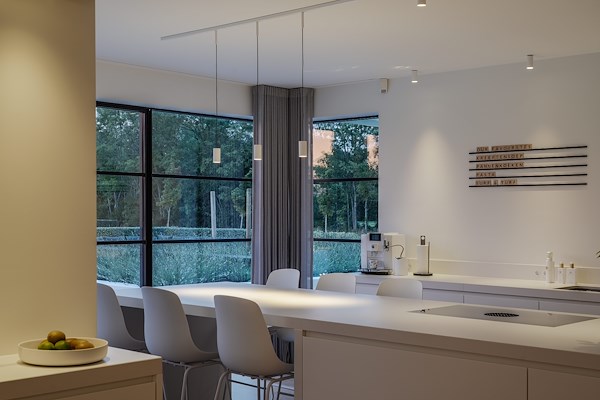 Onze eigen spot ‘Optiled AR111’ is als dubbele inbouwspot opgenomen in het lichtplan en komt in de gehele woning terug. Daarnaast is er gekozen voor de ‘Pista’ van Modular, een 48V rail systeem uitgevoerd in wit, dat subtiel de accenten in de woning uitlicht.