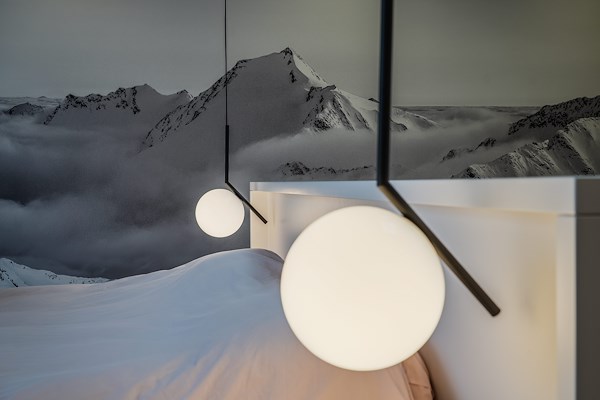In de master bedroom zijn twee opvallende armaturen geplaatst: de hanglampen IC Lights S1 van het merk Flos, ontworpen door Michael Anastassiades. Hij liet zich inspireren door een jongleur die ballen op de toppen van zijn vingers balanceerde, wat resulteert in een perfect uitgebalanceerd ontwerp.