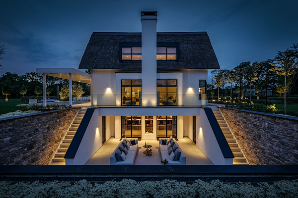 De verlichting in de patio naast het souterrain maakt het geheel helemaal af. De symmetrische trappen aan weerszijden van de woning zijn verlicht, wat een magisch effect geeft. Deze plek is ideaal om te loungen of te ontspannen.