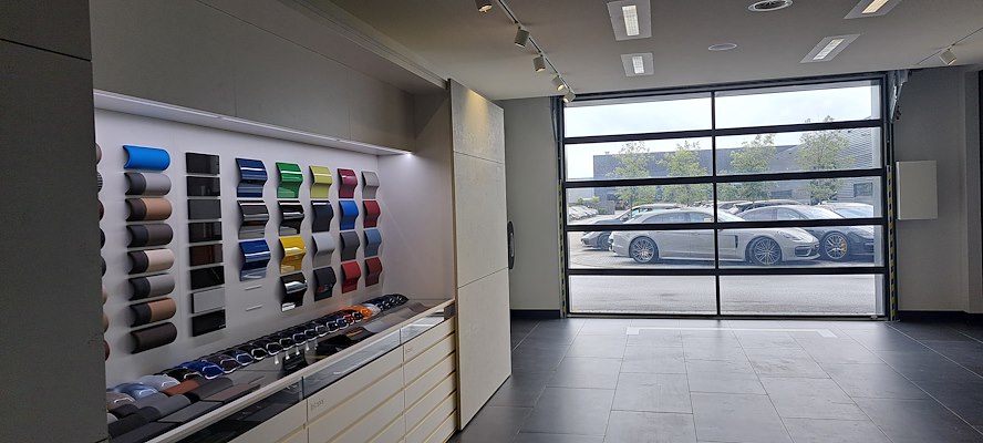 van Rolflex. De Compact deuren, die zowel in de afleverruimtes als in de werkplaats en parkeergarage zijn geïnstalleerd, bieden een ruimtebesparende oplossing met een strak en modern design. Dankzij het unieke vouwsysteem worden de deuren in het plafond weggewerkt, waardoor het ontwerp van het pand én de voertuigen in de ruimtes volledig tot hun recht komen.