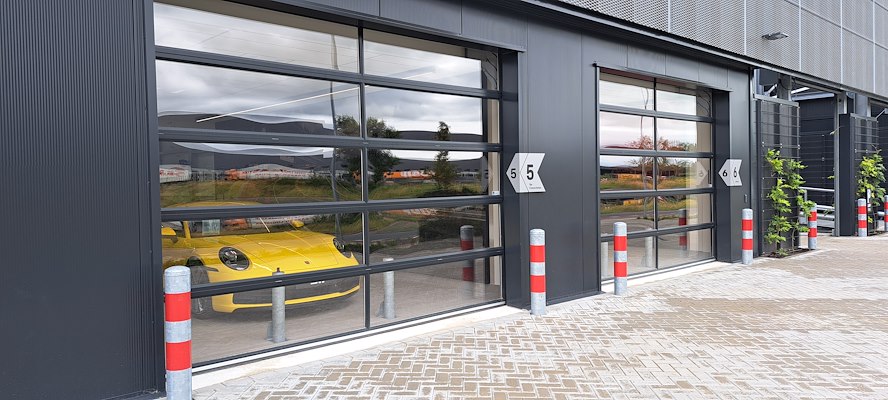 Ook in de werkplaats en de parkeergarage werden Compact deuren geplaatst. Dit keer in een uitvoering met sandwichpanelen en transparante panelen. De ruimtebesparing aan het plafond wordt met name in de parkeergarage goed duidelijk. In de werkplaats is er volop ruimte voor verlichting en installaties rondom de deur, aangezien er geen bovenrails nodig zijn.