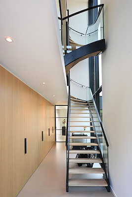Een kwalitatief programma van eisen en de wens voor een hoge entree werden vertaald naar een indrukwekkende entree over meerdere verdiepingen, met links een kastenwand, eveneens over alle verdiepingen en rechts een hoog raam. Het woongedeelte en keuken zijn beiden voorzien van grote, glazen schuifdeuren voor maximale verbinding met buiten. De werkplek op de begane grond kan volledig afgesloten worden en is weggewerkt in een lange kastenwand die doorloopt vanuit de keuken. De eerste etage is voor de drie dochters met een gezamenlijke badkamer, en de bovenste etage is voor de ouders met een ruime slaapkamer met een enorm panoramisch raam, eigen badkamer en kastenwand.