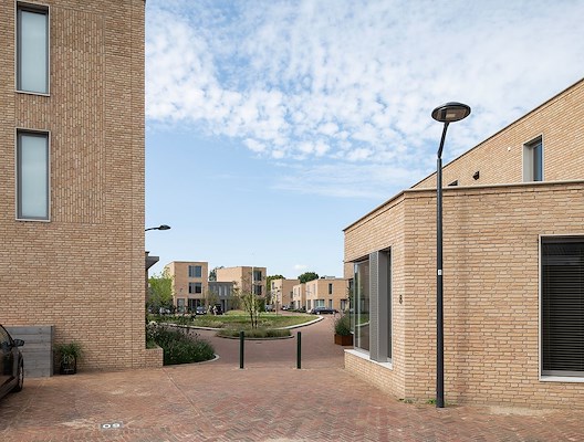 Om de rafelranden van het terrein optimaal te benutten zijn er uiteindelijk 10 verschillende woningtypes ontwikkeld, die, door ze op diverse manieren te schakelen, de randen van het terrein volgen. Hierdoor ontstaat er een interessante gemeenschappelijke ruimte tussen de woningen met verschillende plekken, zoals een informeel erf en een groen hof met wadi. Vanaf verschillende punten op het terrein is er zicht op de nabijgelegen Martinuskerk. Het groene hart van het plan is een fijne plek waar mensen rustig kunnen zitten en die uitnodigt tot elkaar ontmoeten.