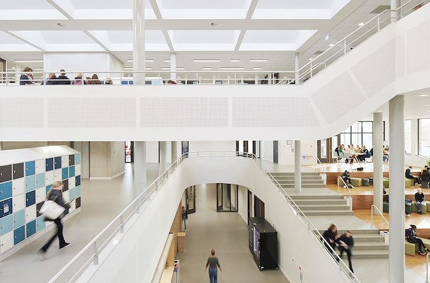 'Leren door Zien' vertaalt zich aan de binnenzijde van de school in het ruimtelijke atrium, waardoor de leerlingen vanaf de verschillende verdiepingen elkaar kunnen zien. De zichtlijnen tussen praktijkonderwijs en theorievloeren maakt dat leerlingen en hun werk zichtbaar zijn voor elkaar, zodat ze elkaar kunnen inspireren. Een vloeiend verloop van verschillende vloerniveaus zorgt voor een continue ruimte zonder harde scheidingen in en rond dit atrium. Op de verschillende tussenniveaus bevinden zich de dynamische werkplekken voor de leerlingen, deze vormen plekken om elkaar te ontmoeten en samen te werken.