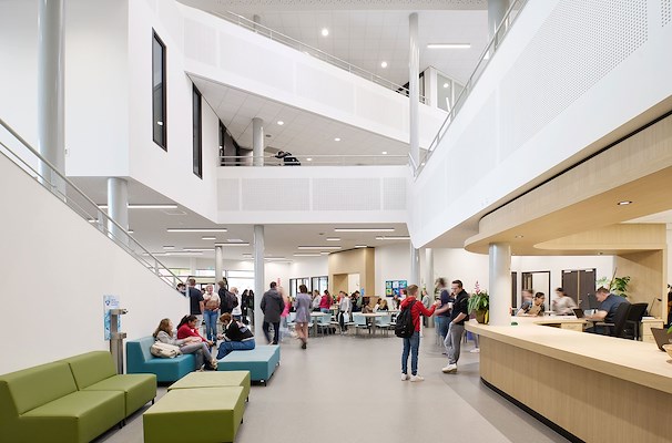 Door het gebouw zoveel mogelijk openheid te geven op de begane grond, vormt het een etalage van het Kompaan College naar de omgeving. Er is een nieuwe langzaam-verkeer-route vanaf het station naar de school. Langs deze route zijn verschillende afdelingen laagdrempelig te vinden voor voorbijgangers. Zo hebben we het mogelijk gemaakt de maatschappij letterlijk de school in te halen door hier een Repaircafé of Salon te vestigen waar leerlingen in de praktijk ervaring kunnen opdoen. 'Leren door Doen' is dan ook het motto van de school.