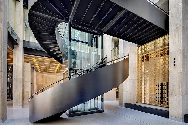 Stalen wenteltrap met stalen constructie liftschacht omringt door glas
