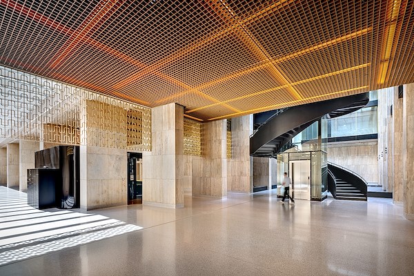 Hekwerk, ontworpen door de architect, gepoedercoat in de kleur Anodic Gold Metallic