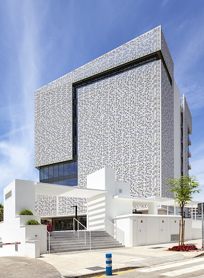 Het spel van licht en schaduw dat kenmerkend is voor het gebouw, werd bereikt dankzij het gestanste ontwerp van de panelen. Er werden zes verschillende patronen ontworpen die, wanneer hun oriëntatie wordt omgekeerd, twaalf worden, waardoor herhaling in het ontwerp wordt vermeden en een unieke visuele afwerking wordt bereikt.