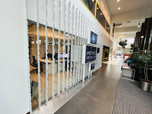Voor het Commissariaat voor de Media hebben wij een uniek en creatief project gerealiseerd in hun ontvangsthal in Hilversum. De opdracht kwam voort uit een inspirerende ontmoeting met een architect tijdens de MaterialDistrict beurs. De architect moest bij dit project meteen aan ons denken. Het idee was om verticaal letters op de wand in de ontvangsthal te hangen.