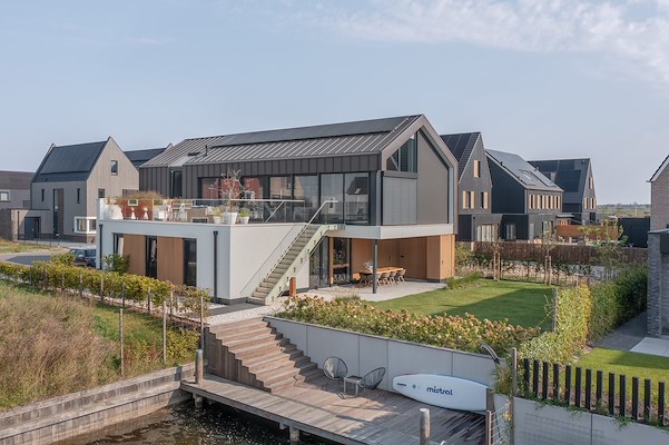 Het exterieur wordt gekenmerkt door een gebroken witte gevel, houten details en een opvallende kap. Tijdens het ontwerpproces voorzagen we deze kap van verschillende tinten en materialen. Uiteindelijk viel de keuze op aluminium platen in een bronzen kleur. In de hoge borstwering van het dakterras is een plantenbak verwerkt die voor privacy zorgt. Hierdoor kunnen de bewoners in alle rust genieten van hun eigen plek aan het water.
