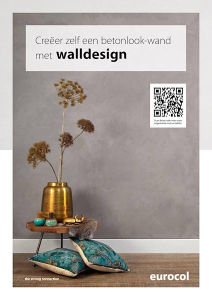 We zien ook lange wanden, die stijlvol zijn afgewerkt met WallDesign, zowel in de inspiratieruimte als in het aangrenzende bedrijfsrestaurant. ‘Dat deel van de inrichting heeft onze klant Rien van Geresteijn uitgevoerd’, zegt Ruud. ‘Zoals je ziet, kun je dat wel aan hem overlaten. Hij heeft er ook de achterwand en het plafond van de receptiebalie mee afgewerkt.’ Ruud wijst ons op een presentatiekast die zijn werkplek aan de zijkant afbakent. ‘Die heeft Michael afgewerkt met DecoDesign. Een mooi product voor vloeren en wanden, maar ook meubilair kun je er een heel eigen uitstraling mee geven.’ Eurocol-producten blijken overigens niet alleen zichtbaar aanwezig. Ruud: ‘De mensen van Desso Tarkett hebben de pvc-stroken verlijmd met