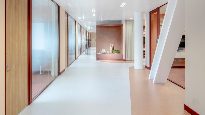 Voor het vloerenontwerp koos JetBrains voor verschillende kleurrijke, homogene vinylvloeren van POLYFLOR. Deze vloeren bieden niet alleen aantrekkelijke vloerconcepten, maar ook veiligheid en hygiëne, wat van groot belang is voor JetBrains. Voor gebieden die een zeer hoge slipweerstand vereisen, werden vloeren uit de POLYFLOR SAFETY-collectie gebruikt. De nadruk bij dit project ligt op duurzaamheid, van gerecycled meubilair