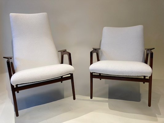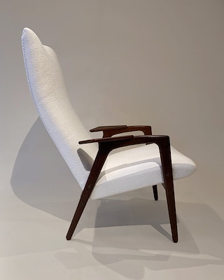 De lijnen van de fauteuils zijn weer helemaal rechtgetrokken naar de oorspronkelijke vorm door vernieuwd binnenwerk. De knuffelbare, spierwitte stof van JAB anstoetz en het donker houten frame komen perfect samen voor een tijdloze look.
