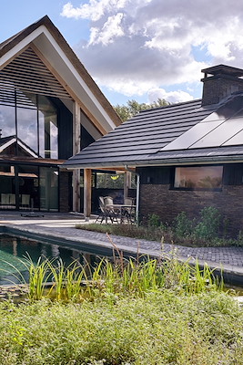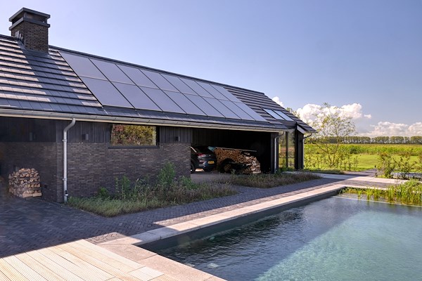 Op een idyllische kavel waar vroeger een oude boerderij stond, staat nu een schuurwoning die prachtig opgaat in de groene omgeving. Deze