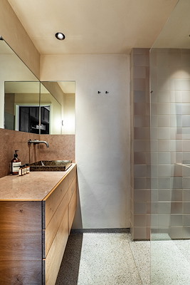 Ook in de badkamer, behalve in de douchehoek, is leemstuc toegepast. Leemstuc werkt vochtregulerend en is daarom erg geschikt voor natte ruimtes. In het toilet en badkamer is verlichting toegepast die tevens werkt als afzuiging.