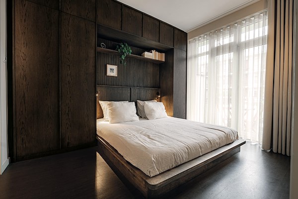 Met slimme, ruimtebesparende oplossingen en het gebruik van op maat gemaakte meubels is elke vierkante meter optimaal benut. En er is veel opbergruimte. In de slaapkamer is het bed en de kast samengevoegd in één meubel, het geeft de ervaring vanhotelluxe. De tweede kamer is niet erg groot. Voor deze kamer is een kastenwand ontworpen met werkblad én een opklapbed, daardoors het zowel een thuiswerkkamer als een logeerkamer en multifunctioneel in gebruik.