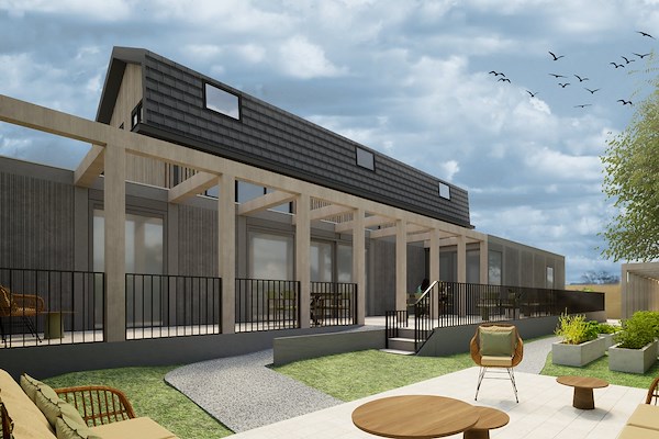 De houten gevelbekleding en veranda vormen een warme en ambachtelijke toevoeging, die zowel de lokale architectonische traditie als de sfeer van een Surinaams balkon oproept. Deze veranda, met zijn open, sociale karakter, biedt bewoners een plek om elkaar te ontmoeten, te genieten van lekker eten en goede gesprekken – een ruimte die bijdraagt aan het welzijn en de gemeenschap binnen de zorgwoning. Het resultaat is een zorgwoning die niet alleen voldoet aan de hedendaagse eisen van comfort en zorg, maar ook een respectvolle en harmonieuze toevoeging is aan het dorpse landschap.